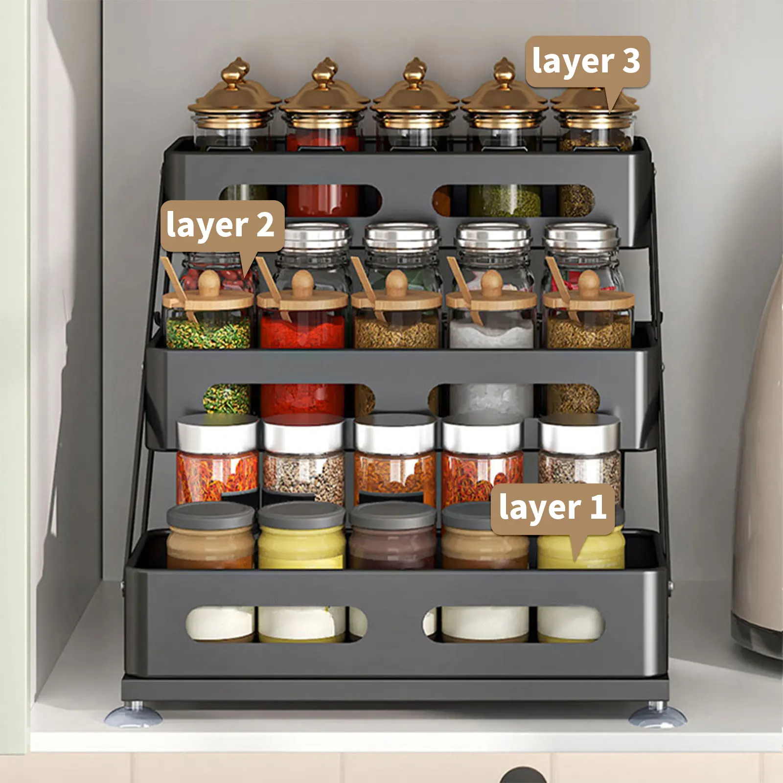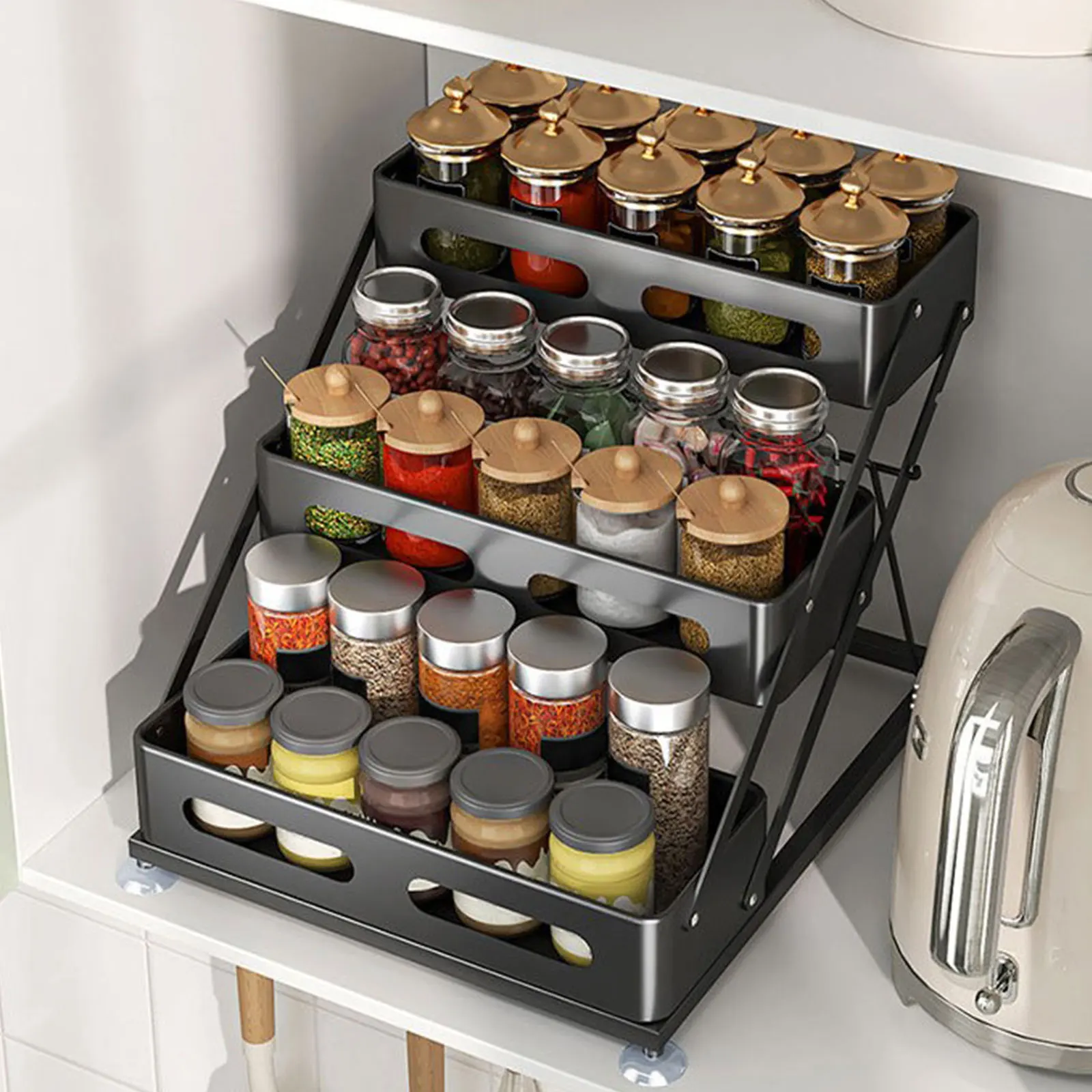 Wprowadź natychmiastowy porządek w swojej kuchni z SpiceTower 3-poziomowym Składanym Organizerem Kuchennym – inteligentnym rozwiązaniem dla wszystkich Twoich przypraw, ziół i akcesoriów kuchennych. Wykonany z wytrzymałego materiału żelaznego z eleganckim czarnym wykończeniem, ten stojak na przyprawy łączy funkcjonalność z elegancją.
